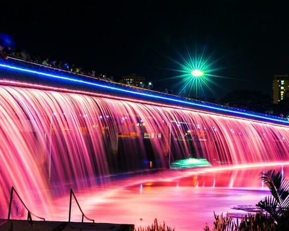 Ngoài bật đèn thì cây cầu cũng sẽ bật thêm hệ thống phun nước. Những tia nước phun theo hình cung, kết hợp cùng ánh đèn lộng lẫy đầy màu sắc, sự kết hợp đó càng giúp tôn lên vẻ đẹp hào nhoáng của không gian nơi đây khi đêm về.